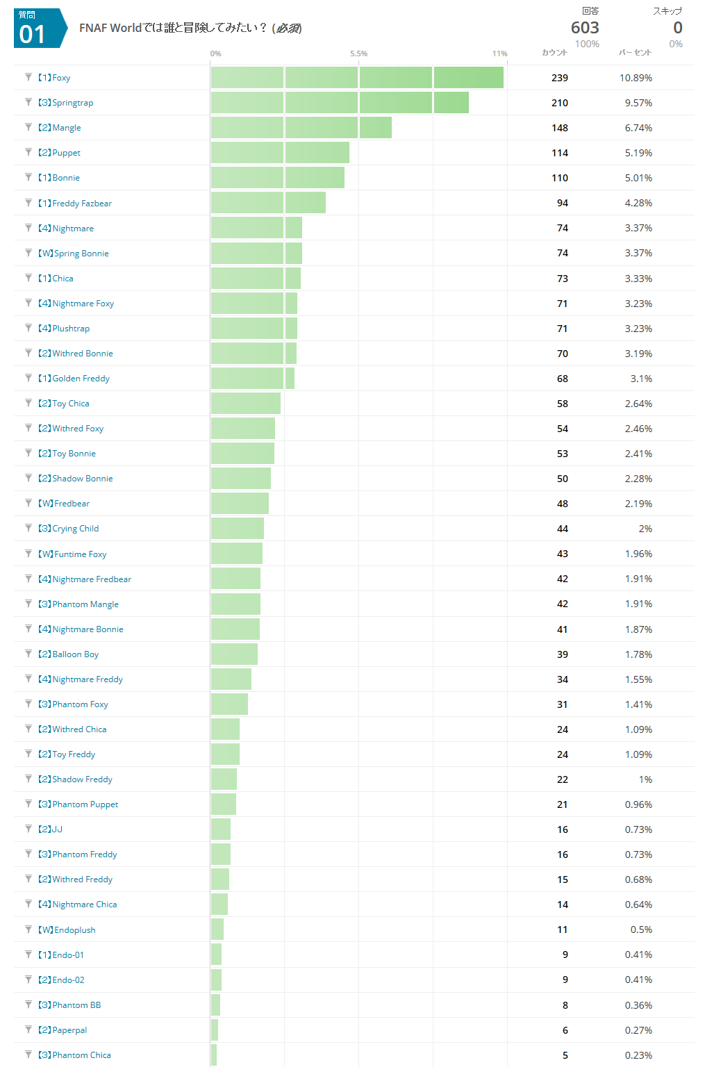 「使えたら使いたかったキャラクター」トップ5FNAF Worldで使用可能な40体以外で、 総回答数:111(全体の約18%)