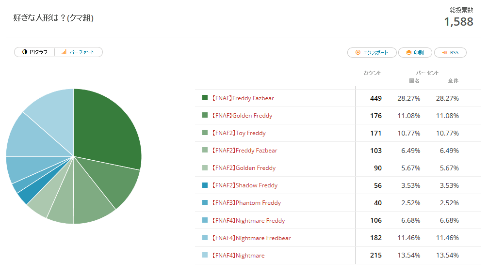 キャラクターの特異性や、ホラーゲーム特有の恐ろしさが人気の秘訣となっているようだ。 ぶっちぎりで1位となったのはFreddy Fazbear(無印)。 <投票者たちのコメント>