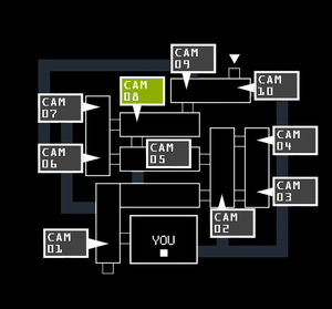 CAM 08 CAM 08は、プレゼント箱やポスターなどが見られる廊下を映すカメラ。 このCAMにもSpringtrapの映り方が2パターンある。 この部屋にだけ出現する幻影はPhantom Puppet。 【ミニゲーム】 画面左側にあるBBのポスターを調べると、 【Springtrap 映り方】 店内マップ
