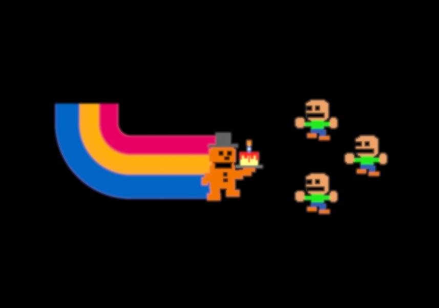 Take Cake to the Children(FNAF2)と同じFreddyもしくはFredbearのドットが、Chica's Magic Rainbowと同じ配色の虹の尾を引いている画像である。
