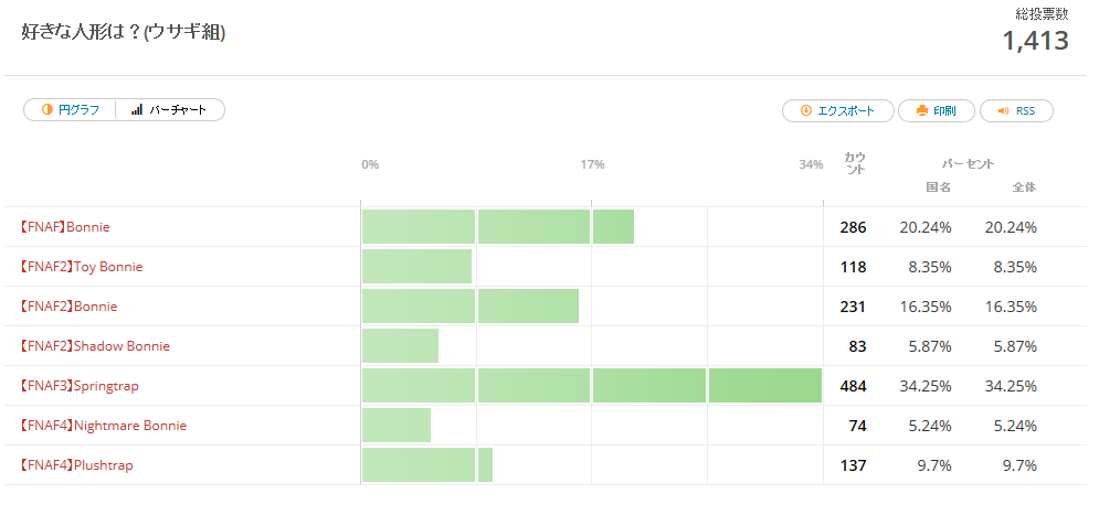 投票実施期間(2015/10/05~2015/10/19 0時) 投票終了! ウサギのアニマトロニクス6体+1体を対象にした人気投票。 投票フォーム※投票は終了しています。 候補者一覧結果発表総投票数:1,413 この投票は、10月19日をもって終了しました。(実施期間:2週間) 今回は様々な事情のため、最下位から発表し、 最下位となってしまい、トップバッターとなってしまったのはNightmare Bonnie(FNAF4)。 このような結果となってしまった理由としてはやはり、 <投票者たちのコメント>