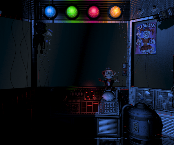 サーカス制御室(Circus Control) Babyのステージ(サーカスの傍聴席?)を制御する部屋。 窓の上部にはカラフルな4色のライトが取り付けられている。 Balloon Boy(FNAF2)と似た人形が吊るされていたり、 この部屋ではサーカスの傍聴席?の様子を確認し、Babyたちに電気ショックを与える作業などを行う。 第2夜にて一時的な停電が起こった際、机の下に隠れてBidybabと攻防を繰り広げることになる。