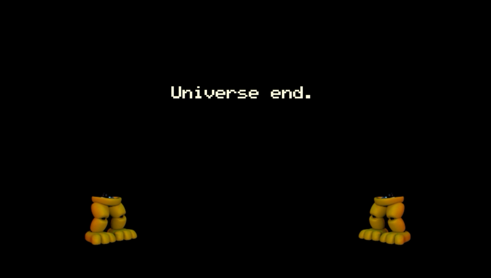 内容は、2体のFredbearが同時にバグり、上半身が爆発するというもの。 Fredbear本人にとっては非常に気の毒なエンディングである。 Universe(宇宙)の名が示す通り、宇宙の理に反して2体の同じキャラクターを出会わせてしまったせいで、 タイムパラドックスが発生してしまったことが原因だと思われる。