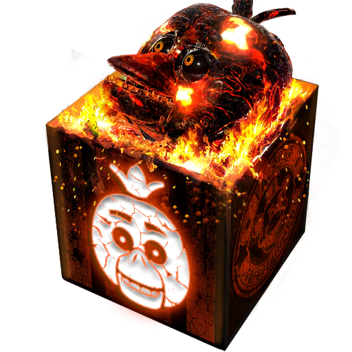 このスキンでは焼け焦げたというよりは溶岩そのものになったかのような風貌となり、 全身が溶岩のように黒く変色し至るところがひび割れており、ところどころ赤熱して発光している。 目も白目部分まで真っ黒になっており(※アイレスではない)、朱い虹彩だけが光を放っている。 よだれかけは完全に跡形もなくなっており、カップケーキも黒焦げで眼球を失っている。 全裸の女の子だぞ、喜べ。