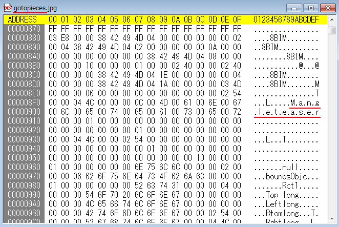 なお、今回の画像「gotopieces.jpg」のバイナリデータに、
