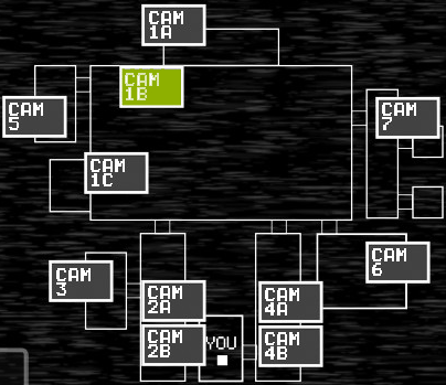 人形達のメインストリートであり、ここを頻繁に通ってくる。 BonnieとChicaは画面の奥、または手前で佇んでいる。 とくにChicaは可愛らしく首をかしげながらカメラを見てくる。とても可愛い。 Freedyは後ろの暗闇で光る目が確認できる。 よく目を凝らすと少しだけ体と腕も見える。