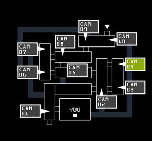 CAM 04 CAM 04は店内の廊下の突き当りを映すカメラ。 この部屋にだけ出現する幻影はファントム マングル。 このCAMにもスプリングトラップの映り方が2パターンある。 二つ目は右下に肩が少し見える程度である。恐らくこの映り方が全CAM中でNo.1の分かりにくさであろう。 【ミニゲーム】 第3夜に限り、灰色のカップケーキが出現する部屋の一つ。 ##hr 店内マップ