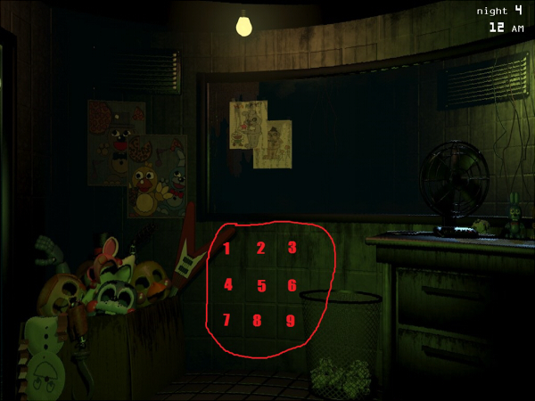 第4夜にて、警備員室で暗号どおりに壁をクリックをすると出現するミニゲーム。 操作キャラクターはゴールデンフレディ。内容は極めて単純で、NEXTのドアを見つけてゴールするだけである。 なお、このミニゲームは条件を満たしていればいつでも何度でも呼び出すことが可能で、 ・通常ゴール ・ケーキエンディング(真ゴール) 1.初期位置の部屋から左に飛び込むと、2部屋分下に落ちる。 なお、出現させるには、下の画像を参考に「 395248 」と入力する。 また、本ミニゲームで使用されてるBGMはチャイコフスキーの白鳥の湖である。 冒頭の一番有名な一節のみ使われている。 |