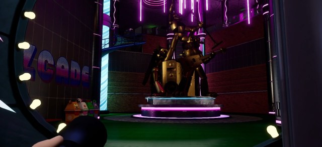 "If you see the DJ, say "Hello." He is such a nice fellow." 4階に位置するアーケード施設。入口のエレベーターは3階にある。 メガプレックスには各所に「Fazcade」という名前のゲームセンターが設置されているが、その中でも最大級。 壁の各所に見える、ネオンの装飾が付いた大小様々な穴が特徴的。 警備員室には、Staff Botの修理ステーションが設置されている。 最奥部の長い廊下には、使われなくなったアーケード機が備品と共に雑多に放置されている。 |