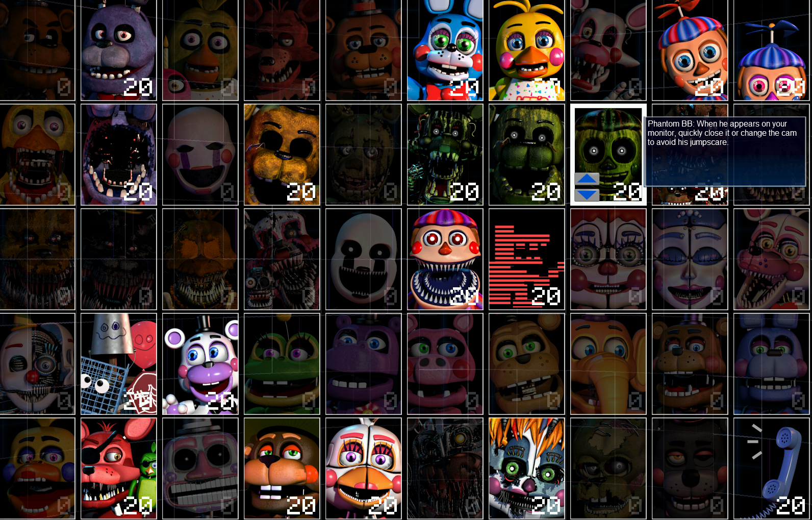 • 50/20以外でXOR出ました!ロックスターボニーの練習のためにAIレベル1のR.ボニーだけにして始めたら開始後少ししたらでました。スコアは610で、ちょうどリスト外アニマトロニクスとR.ボニーの分でした。 -- なめこピクミン? 2018-08-08 (水) 15:03:05