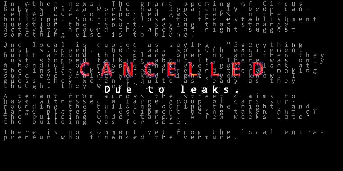 【英文】 In other news: The grand opening of Circus Baby's Pizza World has apparently been cancelled due to reported gas leaks in the building. One local is quoted as saying, A tenant from across the street claims to have witnessed a large group of cars surrounding the building during the night, and large pieces of equipment being taken out of the building under tarps. There is no comment yet from the local entrepreneur who financed the venture. 【訳文】 他のニュース曰く:グランドオープンを控えていたCircus Baby's Pizza Worldは、店内でガス漏れが発生したとの通報により中止となった。 ある地元住民の話では 道路を挟んだ向かい側に住む住人は、夜間に何台もの車が建物を取り囲み、防水シートに覆われた建物から何らかの巨大な機器を運び出すのを目撃したと話している。 この事業に投資した地元企業家からのコメントはまだない。 |