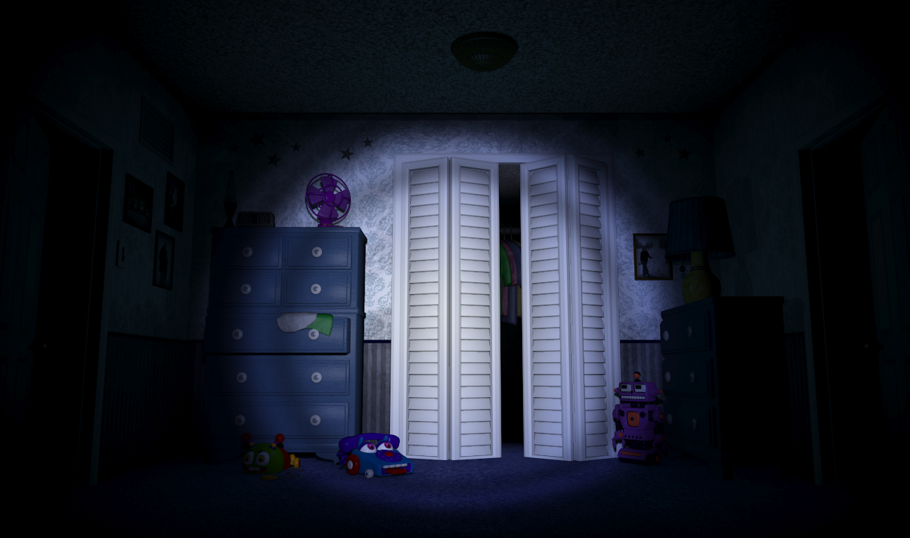 この視点が基本となっているが、この視点から直接発見できるアニマトロニクスはいない。 ただ、クローゼットの扉が少し動く事があるが、これはクローゼットの中にNightmare Foxyが出現した合図である。