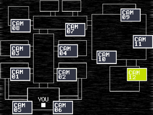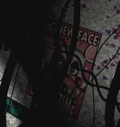 画面右側にある壁には、暗くてよく見えないが、 Mangleの本来の顔のポスター、つまりToy Foxyのポスターが貼られている。