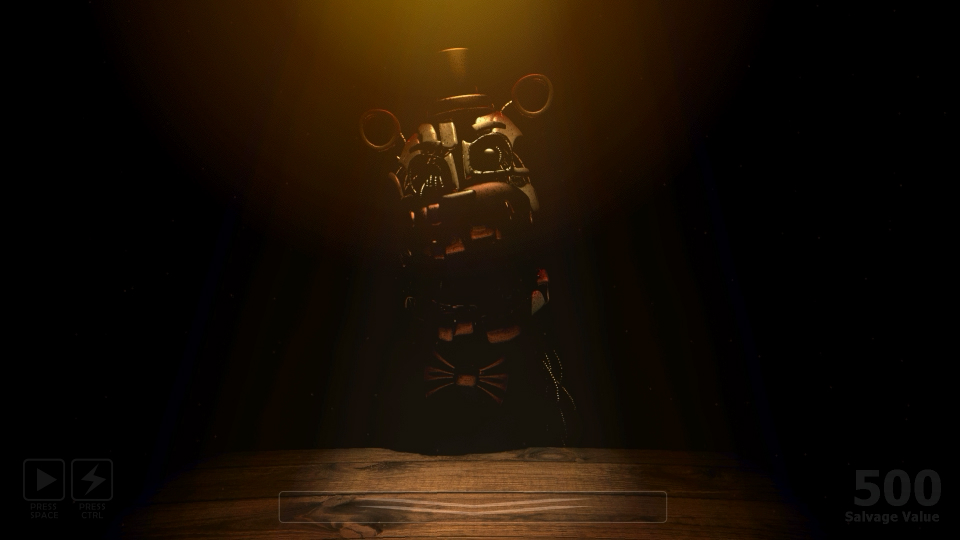 (※)テイザー銃:有線の電極を空気圧で射出する銃型の中距離用スタンガン。 【解説】 Funtime Freddy(FNAFSL)によく似た、ボロボロのアニマトロニクスが回収されて来たらしい。 破棄した場合はタスク処理においてこのアニマトロニクスは出現しなくなる。 【攻略方法】 繰り返しになるが、今作はカメラが存在せず、接近はモーションセンサー、サウンドデコイ、もしくは自分の耳で探知する必要がある。 一定時間しのぎ切る本編シリーズとは異なり、特定のタスクをクリアするという面ではSister Locationのシステムに近い。 モーションセンサー、サウンドデコイ、二次換気ユニットはいずれか1つしか使用できず、複数同時には使用できない。 全てのタスクを完了し、次の日に進もう。 Closing Time!