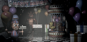 ファズベアーズピザのメインエリア。 「HAPPY BIRTHDAY!」という大きな横断幕がかかっていて、小さいメリーゴーランドなどが置いてある。 入口にはたくさんの風船と、たくさんのプレゼントボックス、 そして手前の左側では笑顔のBBが立っている。 さながら小さな遊園地のよう。 また舞台、プライズコーナーと部屋を共有している。