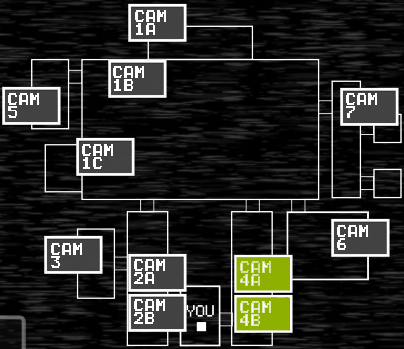 詳しくは幻覚のページを参照。 Freedy、Chicaがこの廊下を通って襲撃を仕掛けてくる。 FreedyのドアップがCAM 4Bに映った場合、 それは彼が攻撃を仕掛ける準備に入ったと言っても過言ではない。襲撃に備える必要がある。 ⇒Freedyを超監視する or カメラを見ている時に右側のドアを閉める