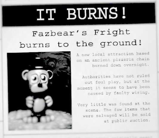 この考察はFNaF4のエンディングは、噛みつき事件では無いということと、電話男=FNaF4の紫の男ということを前提としたものとして考えてもらいたい。 まず最初に、FNaF4のEDの店舗は家族食堂だと思う人がいるかもしれないが、私はそうではなくFF's pizzaだと考えている。 そして、次にその店でフレッドベアーに潰された男の子は、児童行方不明事件の被害者の1人だと考えている。恐らく彼は、店側の信頼の為に何らかの人物によって死体が隠されたのではないかと思う。 児童行方不明事件について、新聞記事に それは、FNaF4の男の子が死ぬ前だと思われる。 また、1人目の被害者はスプリングボニーによって、死んだのではないだろうか。 その理由としては、FNaF3のカセットテープの音声で、 姉妹店でスプリングの事故 の順番で起こったことが確認できる。 そして、1人目の被害者がFNaF4の男の子より前に死んだと言える理由としては、 ・FNaF4の3日目のミニゲームで、舞台側に行こうとすると、 ・また、FNaF4の3日目のミニゲームで、紫の男が被せている人形は舞台にいる人形とはどう見ても違うように見える。これは、FNaF3の4日目の音声で言われた、スプリングボニーの仮の衣装ではないだろうか。 この2つが見れる時には、男の子は生きている。 その後、男の子がフレッドベアーに潰されて、スプリング人形達は、セーフルームに移動され、セーフルームは封鎖。マスコミには報じられるが、死体は誰にも見つかることなく、しばらくの間、封印された。あくまで、しばらくの間…だが。 その後は、完全に私の妄想になってしまうのだが、死亡した2人の子供達はどうなってしまったのか…? 1人目の被害者は、スプリングボニーをかたどる、プラッシュトラップとなり… もう1人の男の子は、フレッドベアーに食べられた(実際には潰されただけだが)ことから、ある悪夢の人形の腹部の中に、潜んでいるのではないだろうか…? |